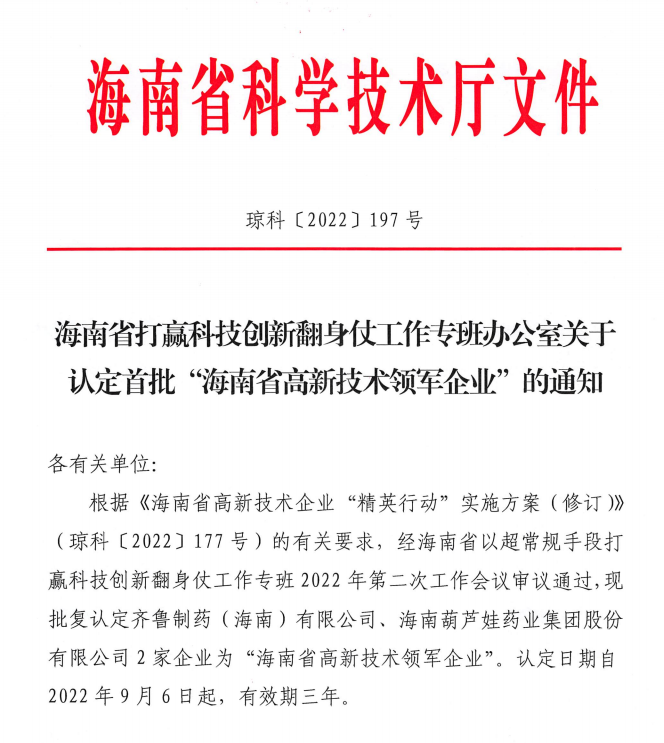 近日,海南省科学技术厅发布的《海南省打赢科技创新翻身仗工作专班办公室关于认定首批“海南省高新技术领军企业”的通知》中显示,批复认定海南3522vip浦京集团药业集团股份有限公司等2家企业为“海南省高新技术领军企业”。认定日期自2022年9月6日起,有效期三年。