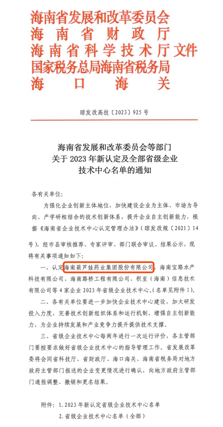 近日,海南省发改委等多部门联合公布了《关于2023年新认定及全部省级企业技术中心名单的通知》,其中,海南3522vip浦京集团药业集团股份有限公司成功通过评审,被认定为省级企业技术中心,是本次获批的4家企业之一。