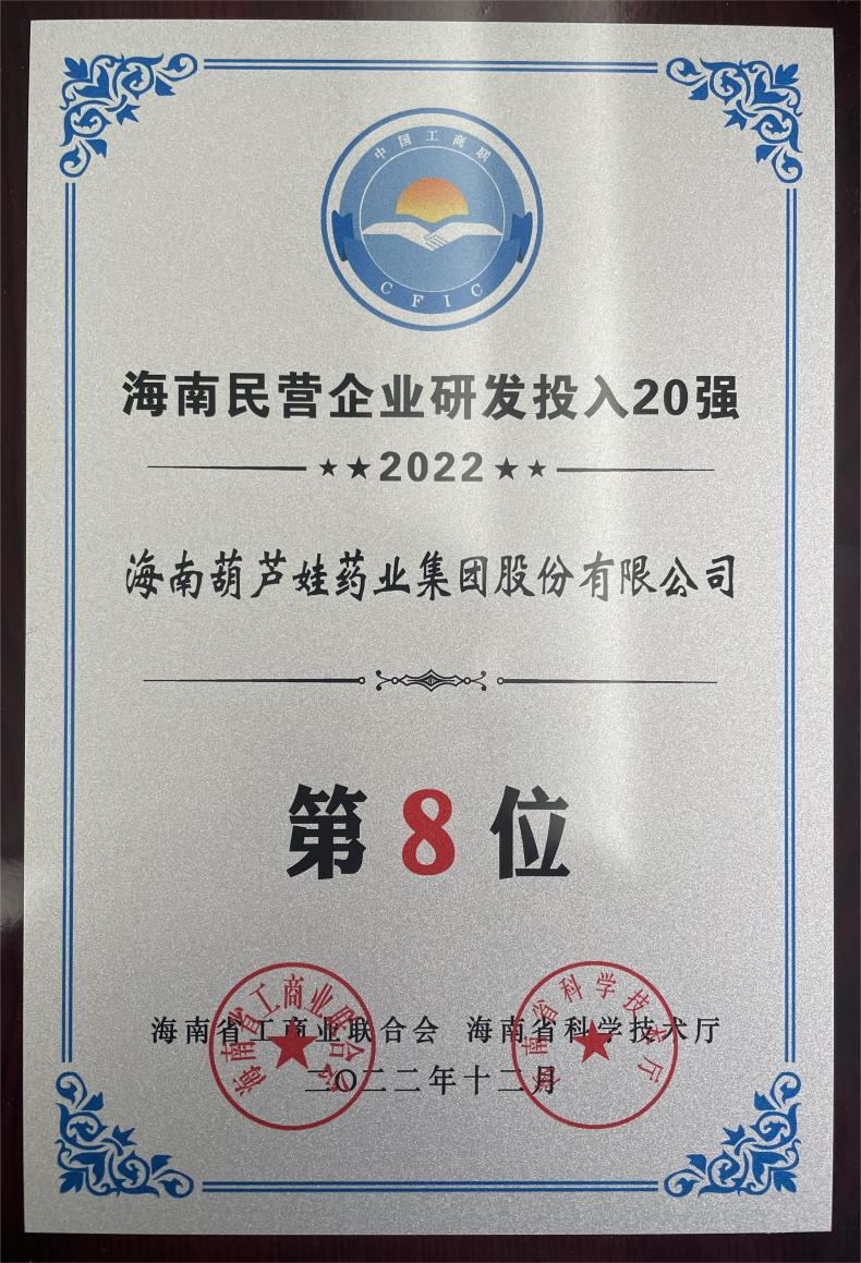 12月23日,2022海南民营企业50强和研发投入20强发布会在海口举行。会上发布了“2022海南民营企业50强”“2022海南民营企业研发投入20强”榜单和分析报告。3522vip浦京集团药业再次荣登两榜,在海南民营企业50强榜单中位列第25位,较去年上升8位,这也是公司连续三年登榜;在海南民营企业研发投入20强中位列第8位,较去年上升7位。